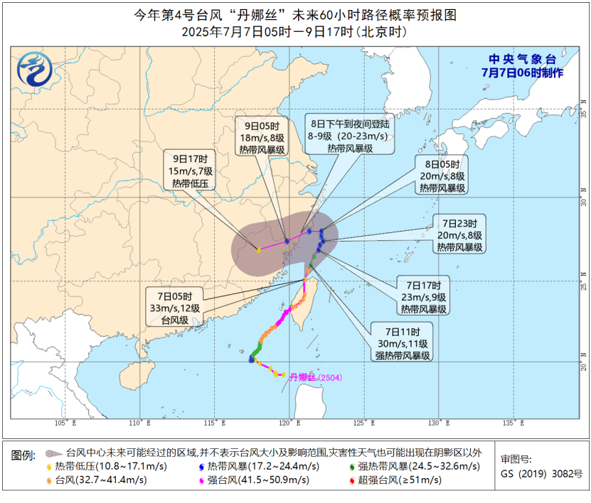 預(yù)計(jì),“丹娜絲”將以每小時(shí)15~20公里的速度向北偏東方向移動(dòng),強(qiáng)度逐漸減弱;8日早晨起轉(zhuǎn)向西偏南方向移動(dòng),逐漸向浙江臺(tái)州至福建福州一帶沿??拷⒂?日下午到夜間在上述沿海登陸(8~9級(jí),18~23米/秒,熱帶風(fēng)暴級(jí))。7月7日08時(shí)至8日08時(shí),南海東部和西南部的部分海域、臺(tái)灣海峽、臺(tái)灣以東洋面、巴士海峽、東海南部及釣魚(yú)島附近海域、福建沿海、浙江沿海、上海沿海、臺(tái)灣島沿海將有6~8級(jí)風(fēng),陣風(fēng)9~10級(jí),其中東海西南部、臺(tái)灣海峽北部、臺(tái)灣以東洋面部分海域風(fēng)力有9~10級(jí),陣風(fēng)11~12級(jí),“丹娜絲”中心經(jīng)過(guò)的附近海域風(fēng)力可達(dá)11~12級(jí)、陣風(fēng)13~14級(jí)。中央氣象臺(tái)7月7日06時(shí)繼續(xù)發(fā)布臺(tái)風(fēng)黃色預(yù)警。