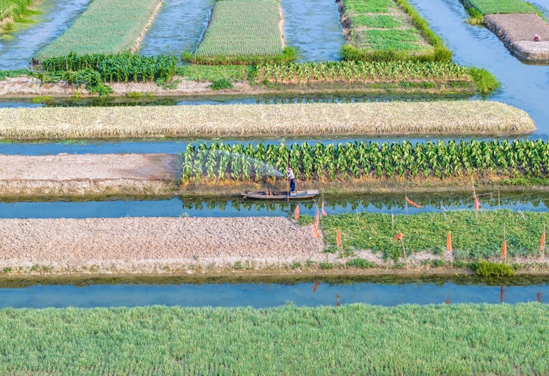 7月7日,農(nóng)民在江蘇省興化市垛田街道高家蕩村田間澆水(無人機(jī)照片)。