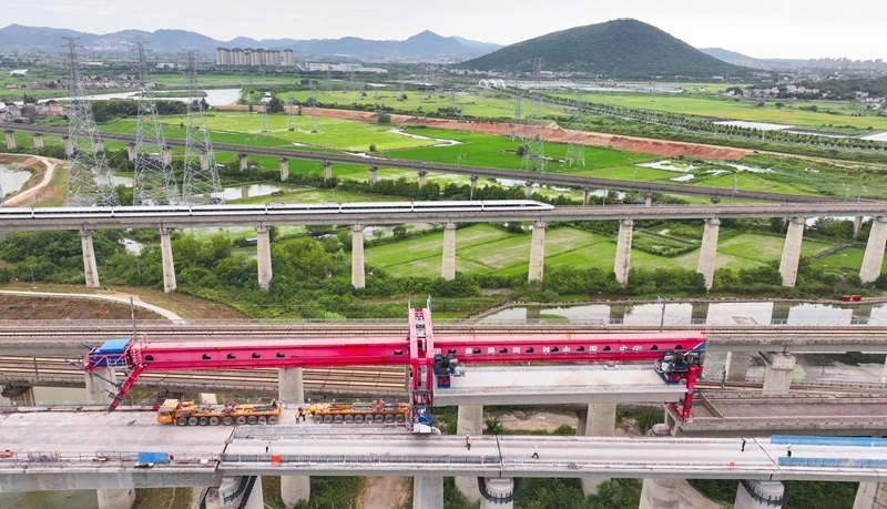 中鐵四局施工機械在巢馬城際鐵路最后一榀箱梁架設(shè)現(xiàn)場作業(yè)(7月8日攝,無人機照片)。