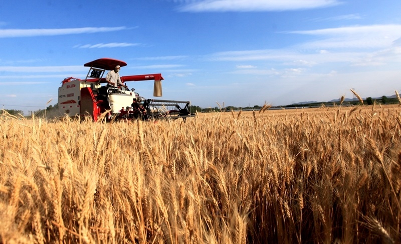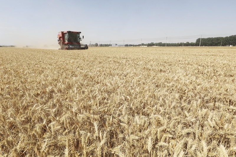 6月10日,河北省石家莊市欒城區(qū)柳林屯鄉(xiāng)東牛村村民駕駛農機收割小麥。