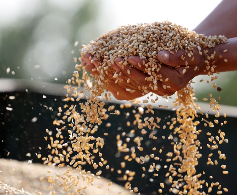 5月28日,山東省臨沂市郯城縣郯城街道農民查看收獲的小麥。