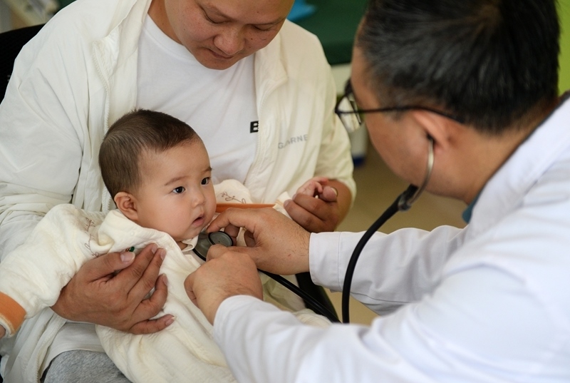 在貴陽市觀山湖區(qū)婦幼保健院,參加“天使之旅——先心病患兒篩查救助行動”的山東第一醫(yī)科大學(xué)附屬中心醫(yī)院醫(yī)療專家在為孩子做檢查(2025年4月22日攝)。新華社記者 劉勇貞 攝