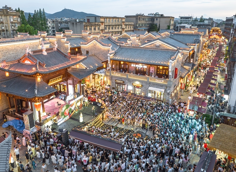 7月25日,游客在湖北省襄陽(yáng)古城管家巷文化休閑街區(qū)觀看星光音樂(lè)會(huì)(無(wú)人機(jī)照片)。