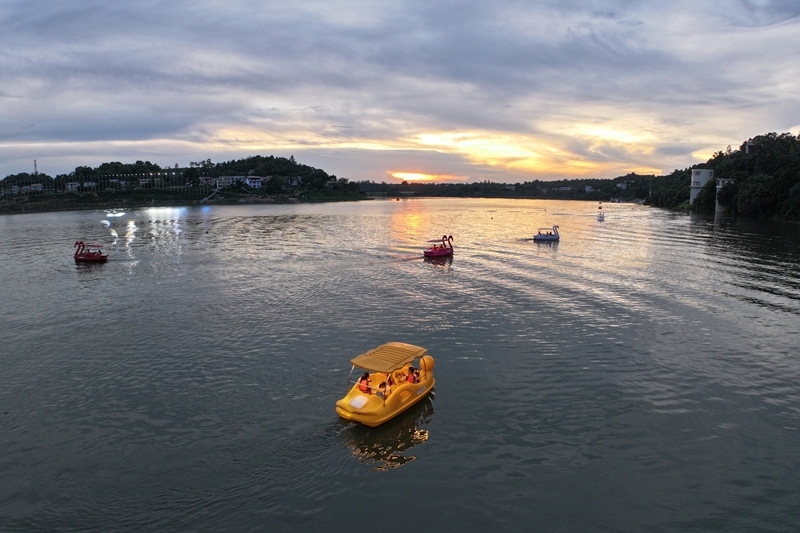 7月25日,人們?cè)谒拇ㄊV安市武勝縣嘉陵江畔龍女湖泛舟游玩。