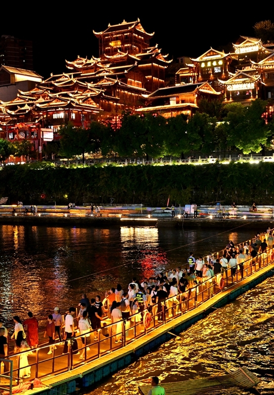 7月24日,游客在湖北省宣恩縣城貢水河浮橋上游玩賞景。