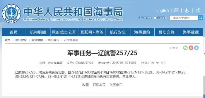 據(jù)中國海事局網(wǎng)站消息,大連海事局發(fā)布航行警告,7月27日16時(shí)至8月10日16時(shí),渤海海峽黃海北部部分海域執(zhí)行軍事任務(wù),禁止駛?cè)搿?/p>