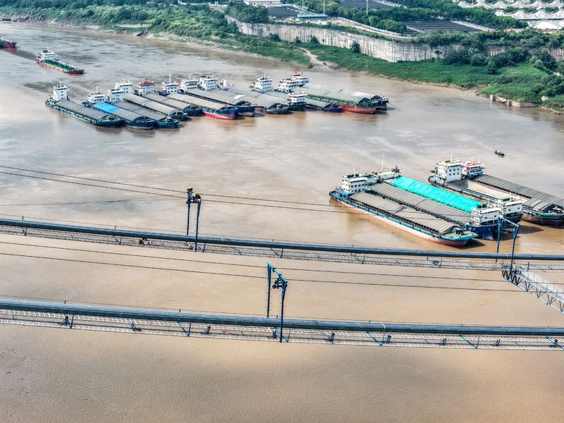 7月30日,在重慶黃桷沱長江大橋建設現(xiàn)場,工人在施工作業(yè)(無人機照片)。