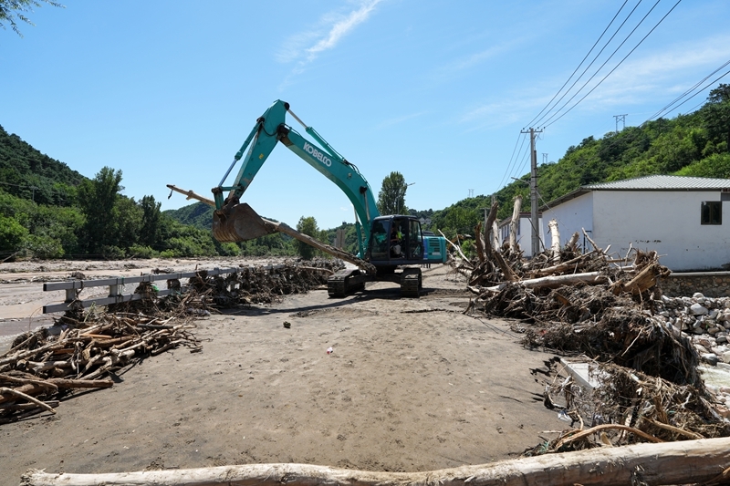 7月30日,在北京市密云區(qū)馮家峪鎮(zhèn),道路搶修人員清理河道。