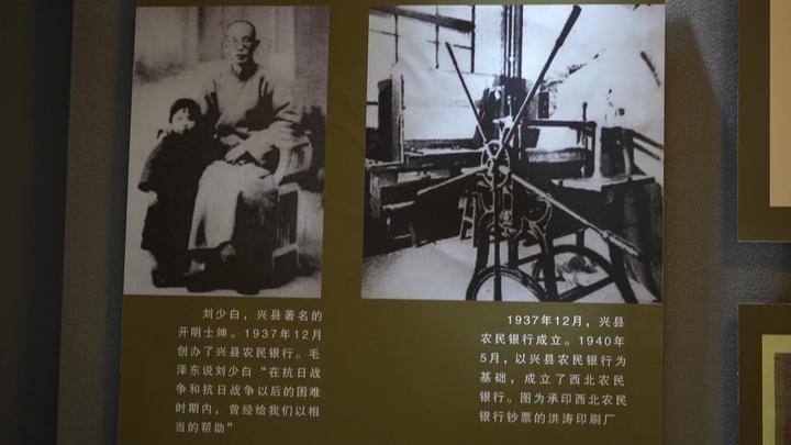 講解員張英介紹說,1937年7月7日,盧溝橋事變爆發(fā),全面抗戰(zhàn)開始,當(dāng)時(shí)八路軍120師的主力(部隊(duì))挺進(jìn)了晉西北,創(chuàng)建了晉西北的抗日根據(jù)地?!爱?dāng)時(shí)我們這個(gè)根據(jù)地的經(jīng)濟(jì)比較繁雜,在當(dāng)時(shí)不僅有偽鈔、法幣還有銀元,以及閻錫山的晉鈔,所以為了有一個(gè)我們中國共產(chǎn)黨領(lǐng)導(dǎo)的銀行,當(dāng)時(shí)就創(chuàng)建了興縣農(nóng)民銀行。1937年12月份的時(shí)候,開明士紳劉少白專門從太原返回到興縣籌備資金,籌備了6萬銀元以及700石糧食,其中蔡家崖的開明士紳牛友蘭獻(xiàn)出了總價(jià)值2.3萬銀元、物資和150石糧食,后期還有楊家坡的楊邦漢獻(xiàn)出了價(jià)值1.5萬元的房地產(chǎn)。”張英表示。
