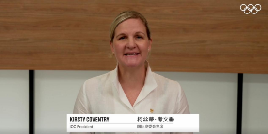 圖為國(guó)際奧委會(huì)主席考文垂發(fā)來(lái)視頻致辭(圖片來(lái)源:新華社)