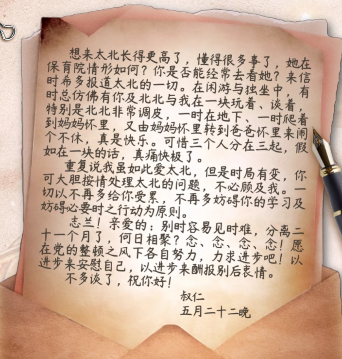 在信的最后,左權(quán)不得不忍痛交代妻子:“我雖如此愛太北,但是時(shí)局有變,你可大膽按情處理太北的問題,不必顧及我?!辈⒚銊钇拮右赃M(jìn)步來安慰自己,以進(jìn)步來酬報(bào)別后衷情。