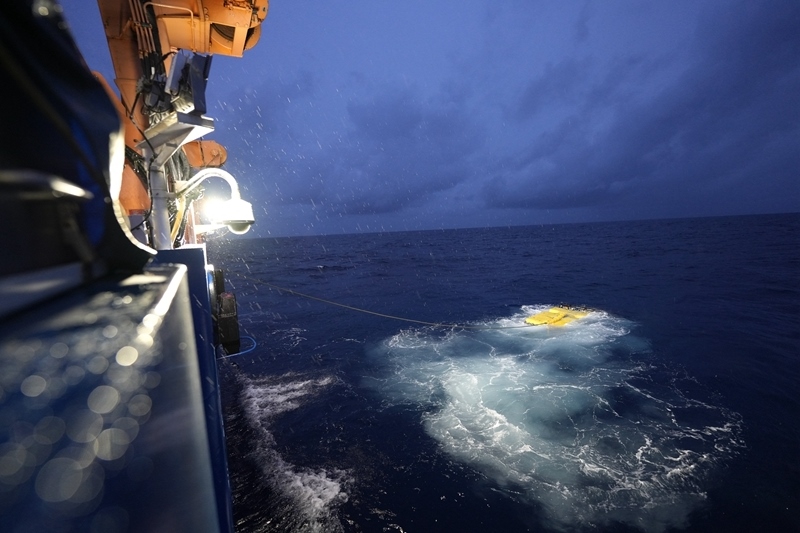 8月22日晚,考察隊員在“中山大學”號船艉主甲板冒雨布放“海琴”號。