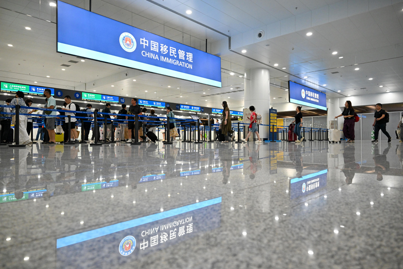 8月27日,在天津濱海國際機場T1航站樓,旅客排隊入境查驗。