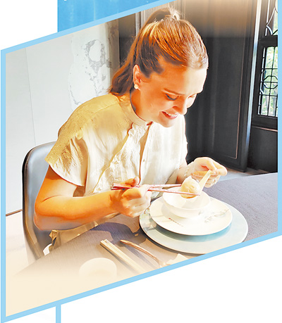 “很神奇,每一口的味道都不一樣,前一口嫩滑,下一口又緊實(shí),接下來又有爆漿的感覺……”羅伯特持刀叉,羅梅羅熟練地使用筷子,兩人大快朵頤。