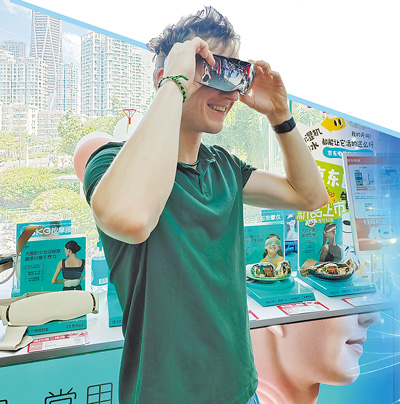 在深圳福田區(qū)華強(qiáng)北群星廣場購物中心,來自德國的小伙子凱試戴電子眼部按摩儀。
