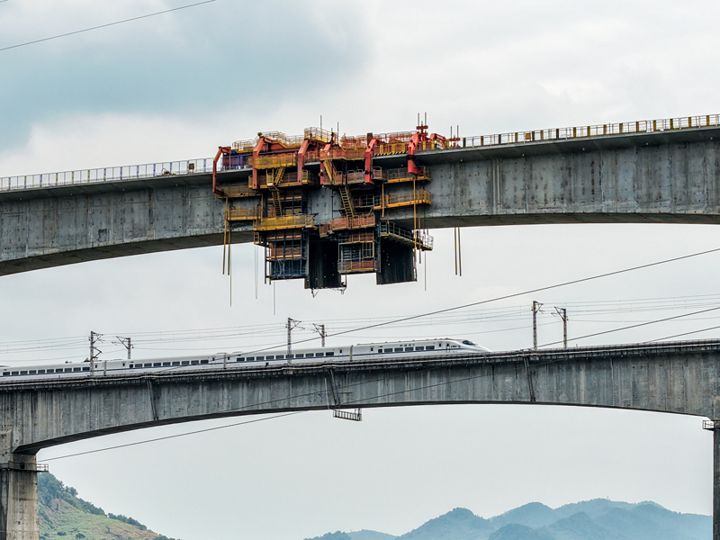 蔡家溝雙線(xiàn)特大橋位于重慶市涪陵區(qū),橫跨長(zhǎng)江支流,是全線(xiàn)重難點(diǎn)工程。大橋主跨采用連續(xù)剛構(gòu)設(shè)計(jì),整體呈“兩端短、中間長(zhǎng)”的對(duì)稱(chēng)結(jié)構(gòu),總跨度達(dá)584米。
