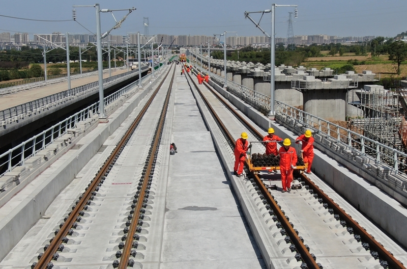 9月8日,在西十高鐵建設(shè)現(xiàn)場(chǎng)西安東至藍(lán)田作業(yè)區(qū)間,施工人員將首對(duì)500米長的無縫鋼軌平穩(wěn)鋪設(shè)在無砟軌道板上,標(biāo)志著由西成客專陜西公司建設(shè)、中鐵四局施工的西十高鐵全線鋪軌正式啟動(dòng)。