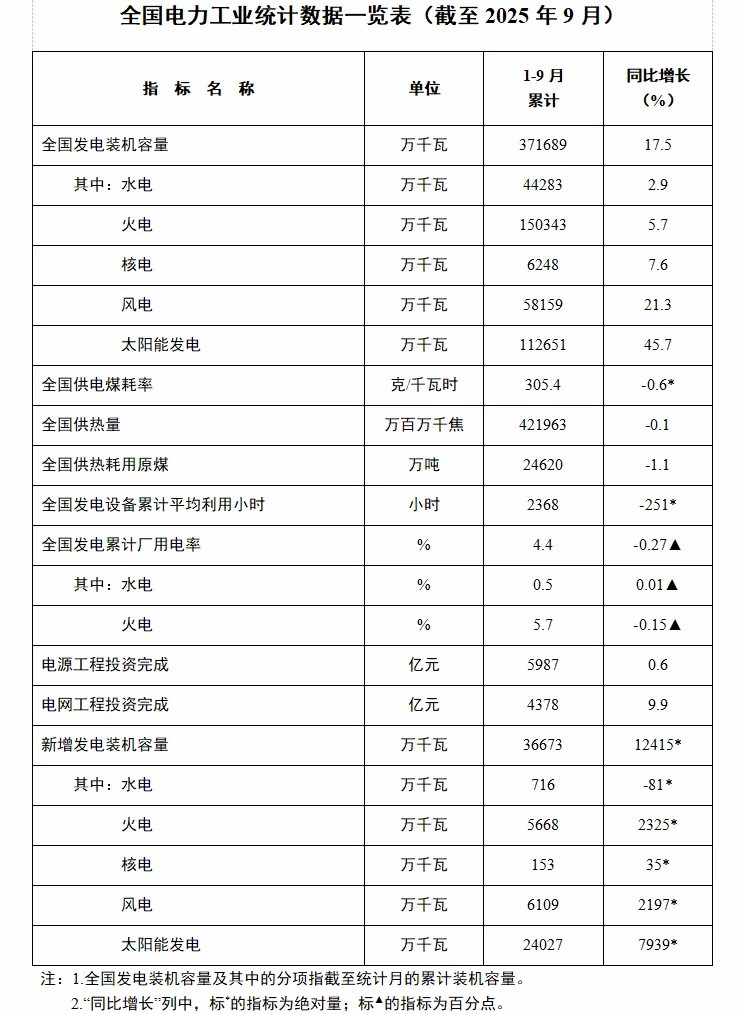 截至9月底,全國累計發(fā)電裝機容量37.2億千瓦,同比增長17.5%。其中,太陽能發(fā)電裝機容量11.3億千瓦,同比增長45.7%;風電裝機容量5.8億千瓦,同比增長21.3%。1-9月份,全國發(fā)電設備累計平均利用2368小時,比上年同期降低251小時。