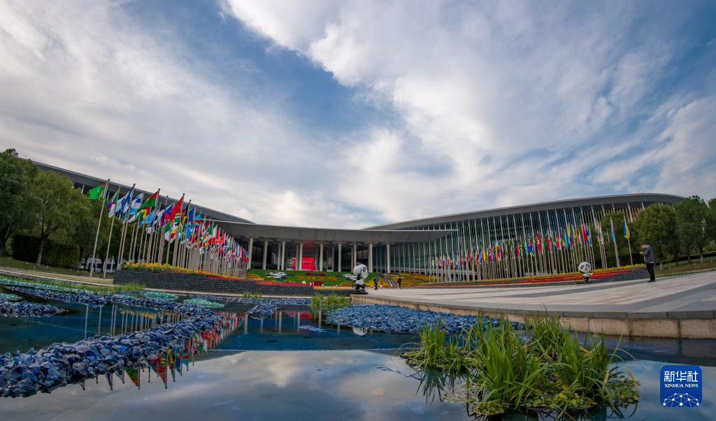 這是裝飾一新的國家會展中心(上海)南廣場(11月3日攝)。