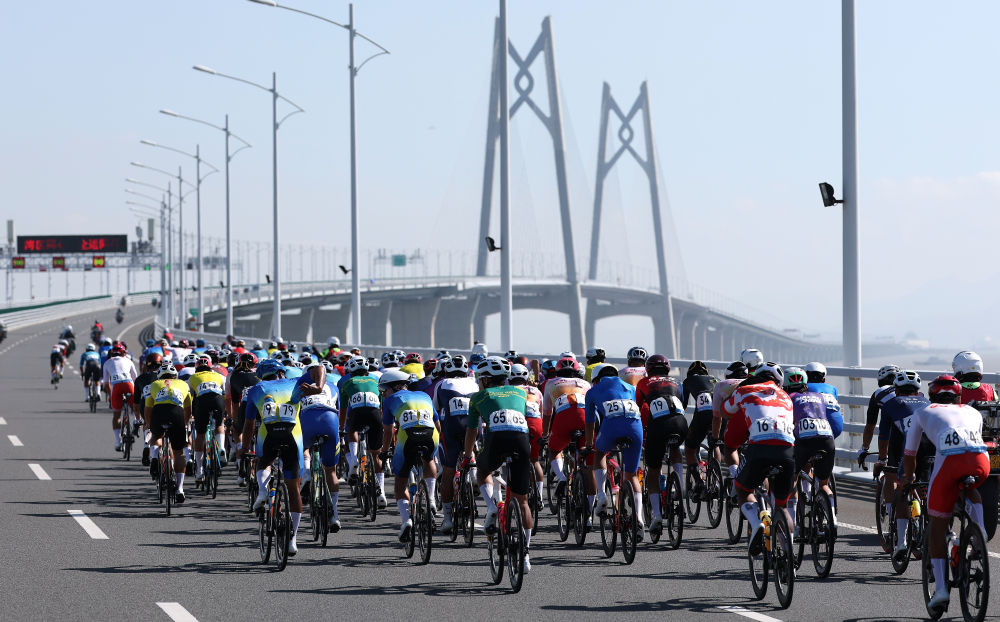 11月8日,參賽選手在港珠澳大橋騎行。當(dāng)日進(jìn)行的第十五屆全國運動會公路自行車男子個人賽,賽道全程231.8公里,選手經(jīng)過港珠澳大橋,跨越粵港澳三地。這是全運會歷史上首次舉辦跨境比賽。新華社記者 毛思倩 攝