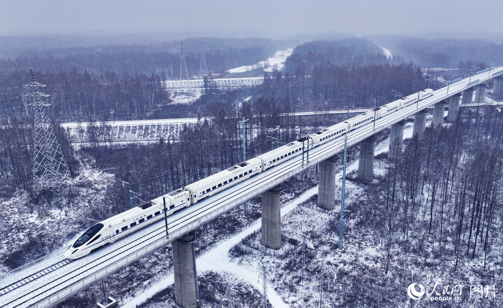 一列復(fù)興號(hào)智能動(dòng)車組列車行駛在沈白高鐵長(zhǎng)白山區(qū)段線路上。