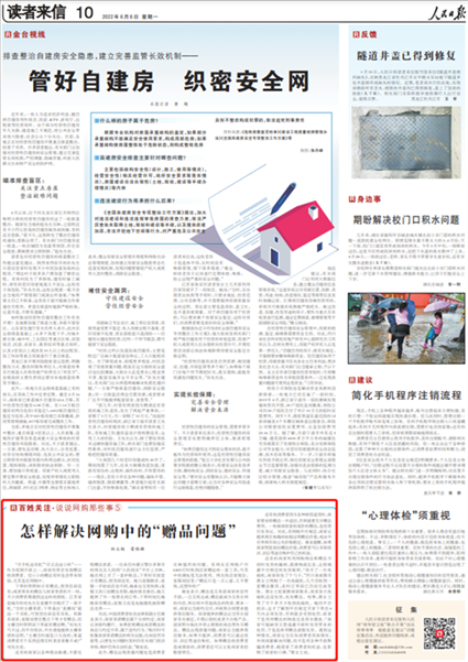 2022年6月6日,《人民日?qǐng)?bào)》讀者來信版“百姓關(guān)注”欄目《怎樣解決網(wǎng)購中的“贈(zèng)品問題”》一文則關(guān)注了“人民投訴”平臺(tái)用戶“下單時(shí)頁面顯示有贈(zèng)品卻未收到,客服回應(yīng)是贈(zèng)品有限、隨機(jī)抽取買家”等線上商家的失信行為。