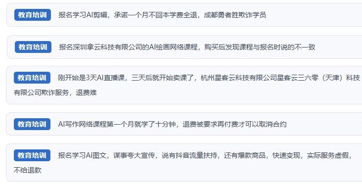 然而,“人民投訴”經(jīng)梳理發(fā)現(xiàn),網(wǎng)絡(luò)上不少消費(fèi)者吐槽相關(guān)課程質(zhì)量良莠不齊,與廣告承諾“免費(fèi)領(lǐng)取AI應(yīng)用體驗(yàn)課及AI工具”“低投入、高回報(bào)”“副業(yè)賺錢”“快速變現(xiàn)”等內(nèi)容大相徑庭。相關(guān)商家虛假宣傳、誘導(dǎo)消費(fèi)、貨不對板以及退費(fèi)難等問題被反復(fù)提及。