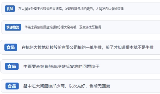 “人民投訴”上不少網(wǎng)友反映,“外賣商家銷售排骨套餐中含過期飲料”“外賣店鋪吃出蟑螂,商家不按照食品安全法賠償” “直播間購(gòu)買車?yán)遄?,虛假宣?J、原裝進(jìn)口,到貨嚴(yán)重貨不對(duì)板”“網(wǎng)購(gòu)東北珍珠貢米,到貨包裝上執(zhí)行標(biāo)準(zhǔn)是廢止的標(biāo)準(zhǔn)”“超市買的梅花肉切開發(fā)現(xiàn)是淋巴肉”“平臺(tái)商家承諾枸杞不熏硫酸,實(shí)則檢測(cè)后含硫超標(biāo)”“知名便利店售賣脫離冷鏈后多次復(fù)凍的餃子”等。