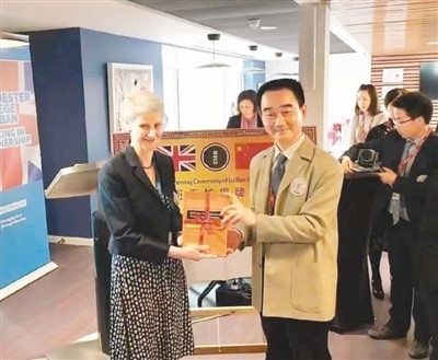 呂景泉(前右)向合作開設(shè)英國(guó)魯班工坊的英方學(xué)校代表贈(zèng)送中方研發(fā)出版的教材。