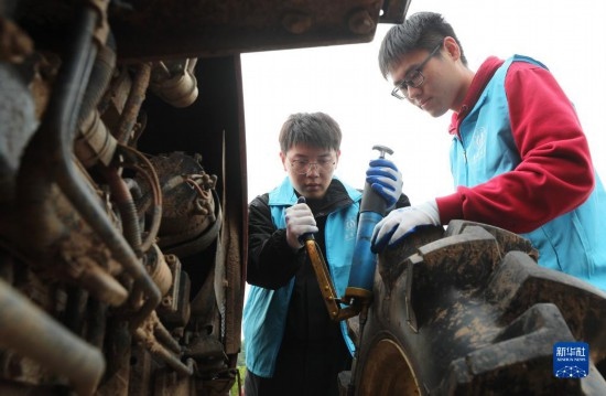 4月29日,在衡陽(yáng)縣西渡鎮(zhèn)新橋村,南華大學(xué)的大學(xué)生志愿者在保養(yǎng)農(nóng)機(jī)。