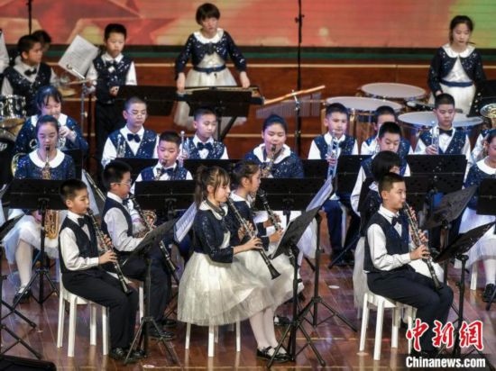 烏魯木齊市第27小學(xué)交響管樂(lè)團(tuán)登臺(tái)獻(xiàn)藝。中新網(wǎng)記者 劉新 攝