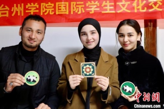 外國留學生展示制作完成的掐絲工藝畫。阮雅妮 攝
