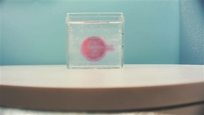 “嗡嗡嗡……”30厘米見(jiàn)方的操作臺(tái)上,一根3D打印針頭扎進(jìn)透明“果凍”中,針口處不斷擠出一根“紅線”,在“果凍”中沿著電腦規(guī)劃好的路線來(lái)回移動(dòng)“作畫(huà)”。當(dāng)針頭自下而上移動(dòng)到“果凍”上端時(shí),只要按下暫停鍵,再將一層新“果凍”疊加到舊“果凍”上面,針頭又開(kāi)始“畫(huà)”起來(lái)。最終,一顆高約6.5厘米的紅色心形3D模型被僅有1.27厘米長(zhǎng)的小針頭精準(zhǔn)打印出來(lái)。
