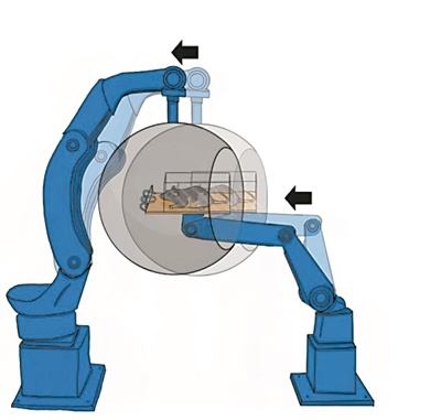 為了破解動物在完全黑暗的管道、隧道中也能迅速轉(zhuǎn)彎、穿越障礙,并準確地抵達目的地的秘密,科學家們設(shè)計了一種獨特的運動模擬器。該模擬器采用同步的工業(yè)機械臂來模擬不同的運動狀態(tài)。實驗中,老鼠被放在模擬器中接受各種運動刺激,儀器同時報告它們感知到的運動方向。結(jié)果顯示,老鼠對極其微小的氣流變化都異常敏感,它們確實能夠利用這種氣流信息,增強自身對運動的感知和判斷力。