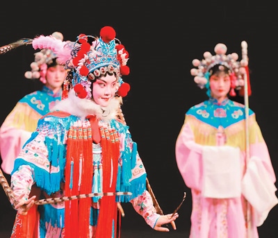 史欣玉(前)表演京劇時(shí)舞臺(tái)照。
