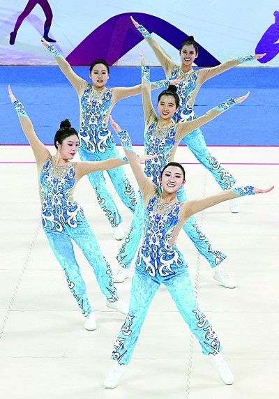 12月5日,第18屆中國大學(xué)生健美操錦標(biāo)賽在河北省遷安市舉行。圖為江西師范大學(xué)代表隊(duì)在甲組中國大學(xué)生中級(jí)校園健美操規(guī)定動(dòng)作決賽中。新華社記者 楊世堯攝