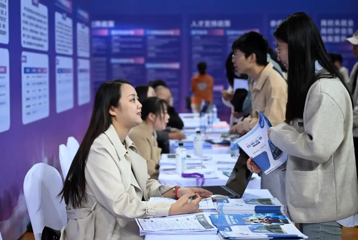 3月20日,環(huán)渤海城市聯(lián)合招聘高校畢業(yè)生春季專場活動在天津職業(yè)技術(shù)師范大學(xué)啟動,來自環(huán)渤海地區(qū)400多家企業(yè)提供崗位1.1萬個?;顒蝇F(xiàn)場還設(shè)立就業(yè)服務(wù)臺,為學(xué)生提供指導(dǎo)。圖為當(dāng)日,求職學(xué)生(右)和招聘方代表在招聘會現(xiàn)場交談。新華社記者 趙子碩攝