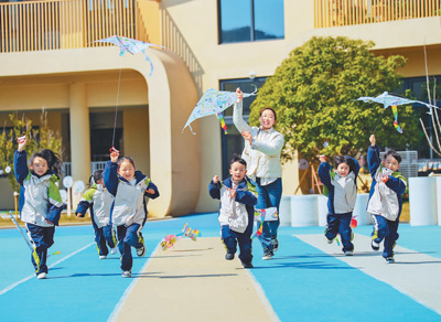 浙江省湖州市長(zhǎng)興縣泗安鎮(zhèn)中心幼兒園,孩子們和老師一起放飛彩繪風(fēng)箏。