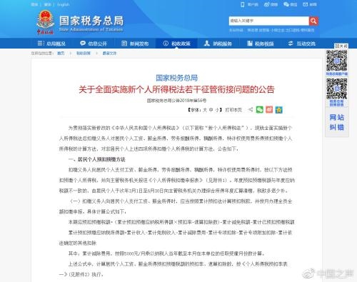 據中國之聲《新聞縱橫》報道:新修改的個人所得稅法將于2019年1月1日正式實施。國家稅務總局日前發(fā)布公告明確了全面實施新個人所得稅法的征管辦法,確保新舊稅制平穩(wěn)過渡。
