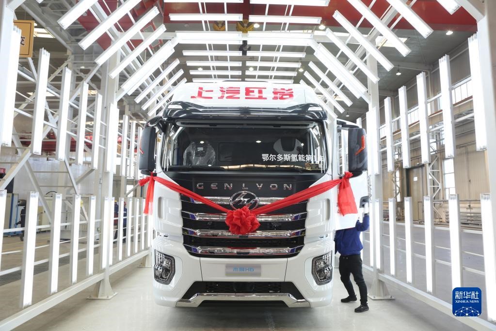 上汽紅巖鄂爾多斯基地天隆工廠生產(chǎn)的首臺氫能重卡。(受訪者供圖)