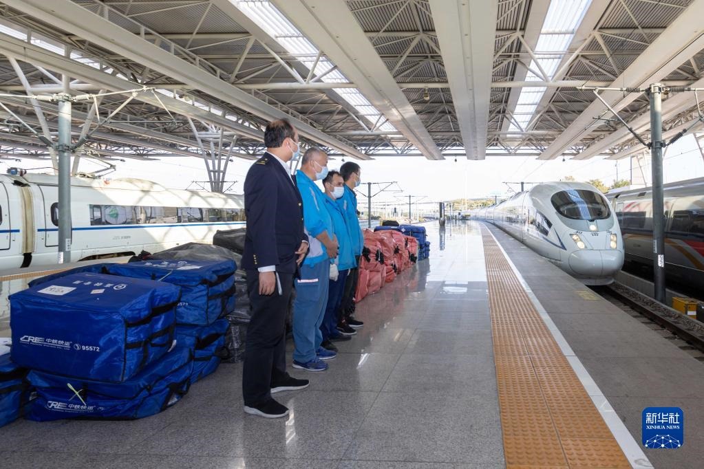11月1日,在G1373次列車上,鐵路工作人員搬運貨物。新華社記者 王翔 攝