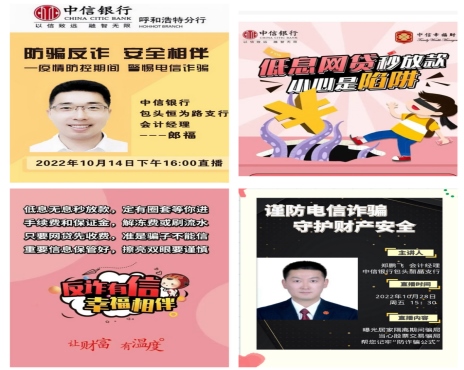 疫情期間,中信銀行呼和浩特分行各經(jīng)營(yíng)機(jī)構(gòu)積極開(kāi)展線上反詐宣傳,通過(guò)朋友圈、公眾號(hào)及線上直播活動(dòng)積極開(kāi)展金融反詐宣傳,切實(shí)提升金融客戶(hù)識(shí)別詐騙手段的能力和防范金融風(fēng)險(xiǎn)的意識(shí)。