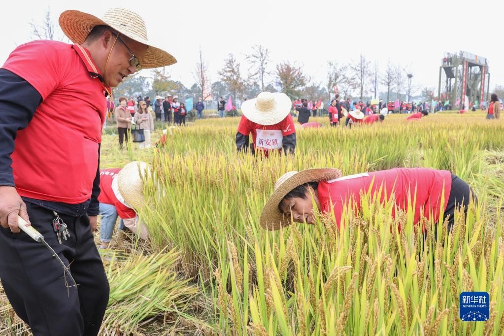 11月15日,在德清縣舉辦的美好家園運動會暨新安鎮(zhèn)稻田爭霸賽上,村民參加割稻比賽。新華社發(fā)(姚海翔 攝)