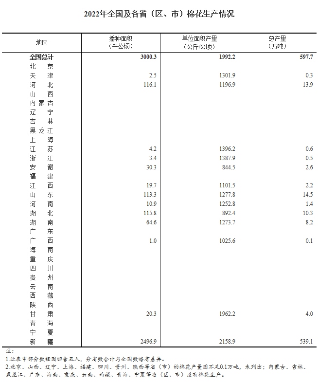 國家統(tǒng)計(jì)局26日公布數(shù)據(jù)顯示,根據(jù)對全國31個(gè)省(區(qū)、市)的統(tǒng)計(jì)調(diào)查(新疆棉花播種面積通過遙感測量取得),2022年全國棉花播種面積4500.4萬畝,比上年減少41.8萬畝,下降0.9%;單產(chǎn)132.8公斤/畝,比上年增加6.6公斤/畝,增長5.3%;產(chǎn)量597.7萬噸,比上年增加24.6萬噸,增長4.3%。