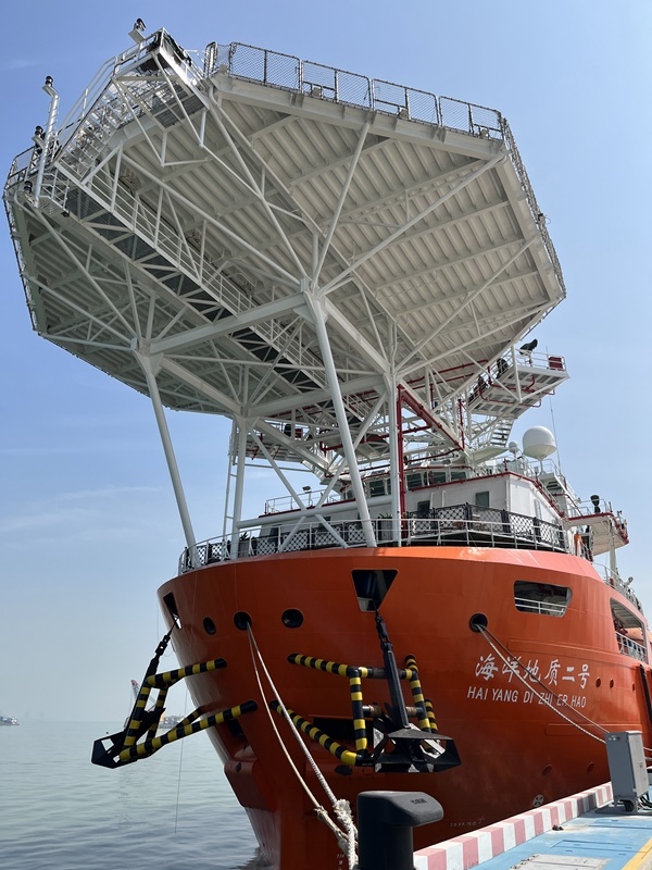碼頭啟用當(dāng)日,“海洋地質(zhì)二號”多功能新型科考船也正式入列中國地質(zhì)調(diào)查局廣州海洋地質(zhì)調(diào)查局。廣州海洋地質(zhì)調(diào)查局海洋地質(zhì)二號船長黃棉煜介紹,“海洋地質(zhì)二號”總長85米,型寬22米,型深8米,排水量7224噸,航速12.5節(jié),可載員150人,自持力35天,續(xù)航力12000海里,配備了150噸主動深沉補償海工吊、A型架、萬米光纖絞車和地質(zhì)絞車、海上水文環(huán)境測量等調(diào)查設(shè)備。
