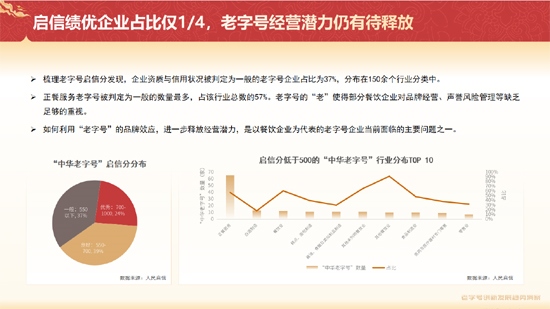 《報(bào)告》提出,從企業(yè)側(cè)來(lái)看,企業(yè)資質(zhì)與信用狀況被判定為一般的老字號(hào)企業(yè)占比37%,分布在150余個(gè)行業(yè)分類(lèi)中。老字號(hào)的“老”使得部分餐飲企業(yè)對(duì)品牌經(jīng)營(yíng)、聲譽(yù)風(fēng)險(xiǎn)管理等缺乏足夠的重視。