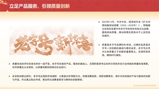 《報(bào)告》分析稱(chēng),老字號(hào)企業(yè)可以從四方面推進(jìn)創(chuàng)新進(jìn)程,提高創(chuàng)新質(zhì)效。一是立足產(chǎn)品服務(wù),引領(lǐng)質(zhì)量創(chuàng)新;二是挖掘自身特色,強(qiáng)化科技賦能;三是借力政策東風(fēng),蓄勢(shì)揚(yáng)帆遠(yuǎn)航;四是創(chuàng)新品牌形象,注重品牌內(nèi)涵。