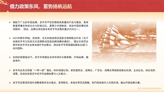 《報(bào)告》提到,在利好政策驅(qū)動(dòng)下,老字號(hào)有望在全球市場(chǎng)中大展拳腳,打響品牌,掘金海外。具體來(lái)看,老字號(hào)應(yīng)充分把握“一帶一路”倡議、RCEP政策紅利,抓住國(guó)家級(jí)展會(huì)機(jī)遇,主動(dòng)出擊,結(jié)合實(shí)際場(chǎng)景,訴說(shuō)歷史變遷中老字號(hào)品牌故事與人文魅力。