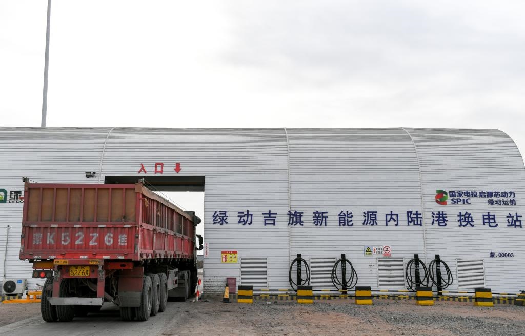 在鄂爾多斯市東勝區(qū)綠動(dòng)萬(wàn)利新能源智慧陸港,新能源重卡進(jìn)行全自動(dòng)換電。新華社記者貝赫 攝
