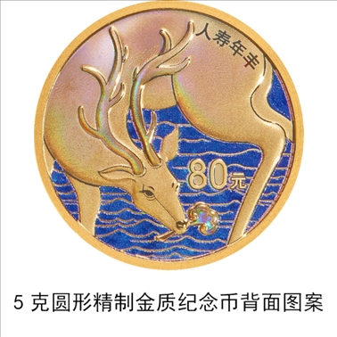 背面圖案方面,5克圓形金質“人壽年豐”紀念幣背面圖案為鹿、靈芝、水紋等裝飾組合圖案,并刊“人壽年豐”字樣及面額。